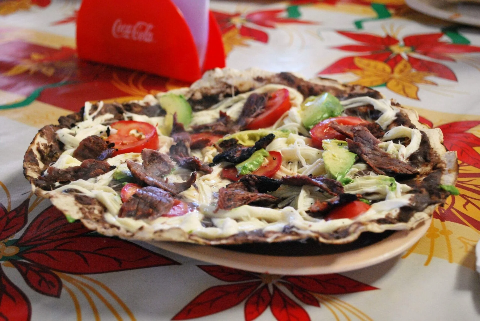 Sometimes called a “Oaxacan pizza,” tlayudas are large, crispy tortillas topped with beans, cheese, lettuce, avocado, and your choice of meat—often tasajo (thin beef) or chorizo. If you’re wondering what to eat in Oaxaca, this is one of the most beloved local dishes.